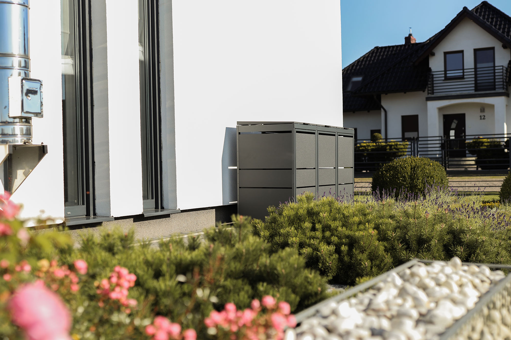 Styl nowoczesny chętnie wykorzystuje geometryczne formy. Bardzo ważne jest współgranie ze sobą poszczególnych elementów. Co to oznacza w praktyce? Jeśli chcesz umieścić na posesji obudowy śmietników, pamiętaj, aby były one utrzymane w tym samym stylu, co dom i jego elewacja, a także ogród. Dzięki temu stworzysz spójną całość.