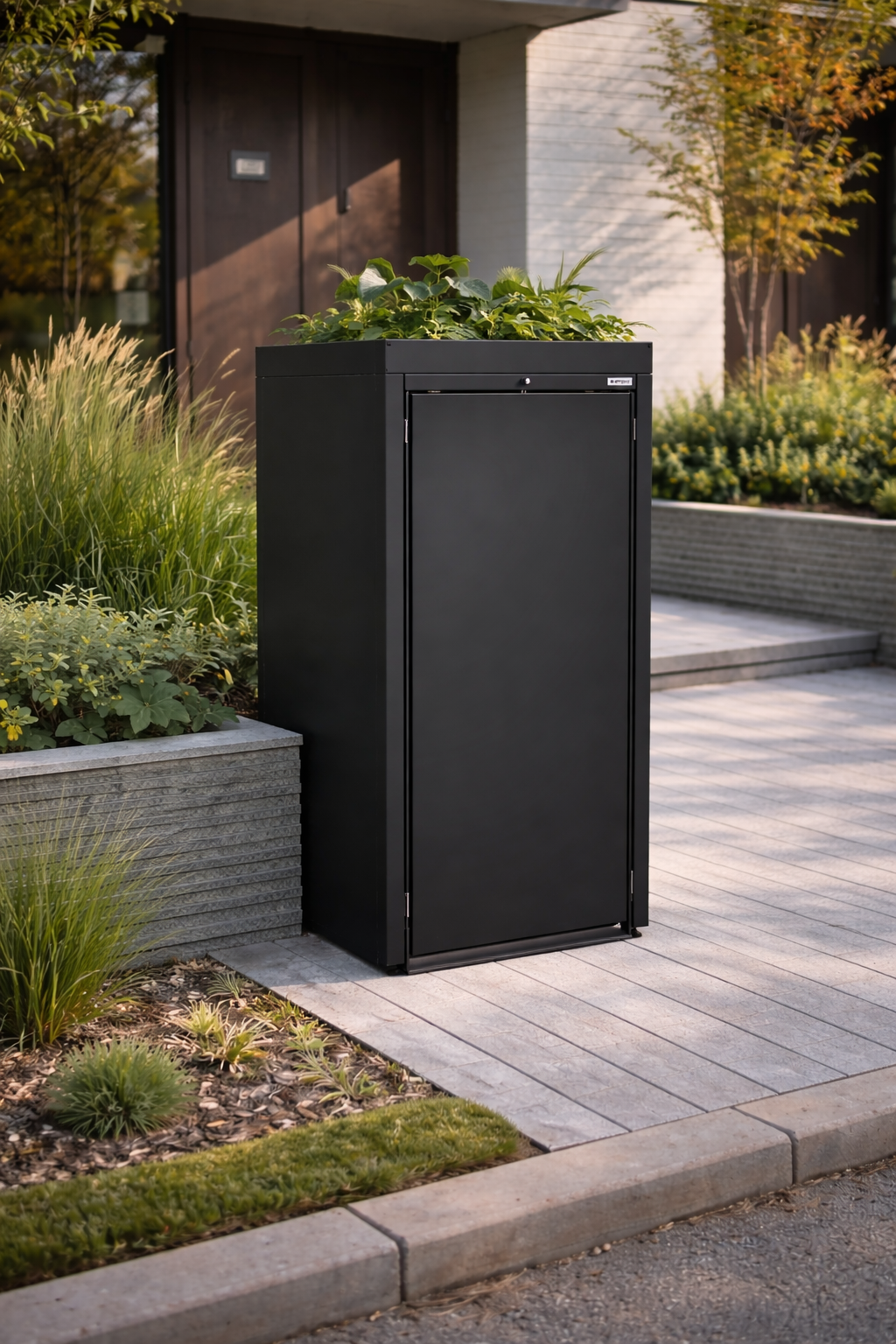 TOP BOX INDIVIDUAL to stylowe i funkcjonalne modułowe systemy zabudowy pojemników, zaprojektowane z myślą o nowoczesnych przestrzeniach przydomowych. Prosta, minimalistyczna forma sprawia, że obudowa doskonale komponuje się z współczesną architekturą, nadając otoczeniu elegancki i uporządkowany wygląd.