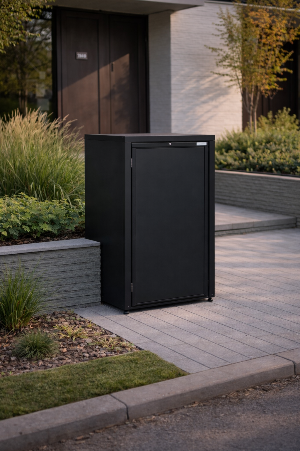 Dzięki przemyślanej konstrukcji pojemniki na odpady zostają estetycznie ukryte przed wzrokiem, stając się jednocześnie spójnym i designerskim elementem aranżacji posesji.