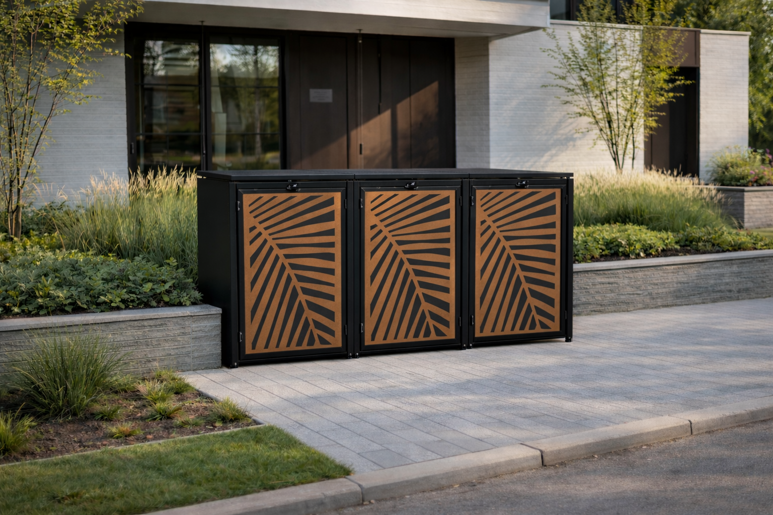 Dzięki przemyślanej konstrukcji pojemniki na odpady zostają estetycznie ukryte przed wzrokiem, stając się jednocześnie spójnym i designerskim elementem aranżacji posesji.