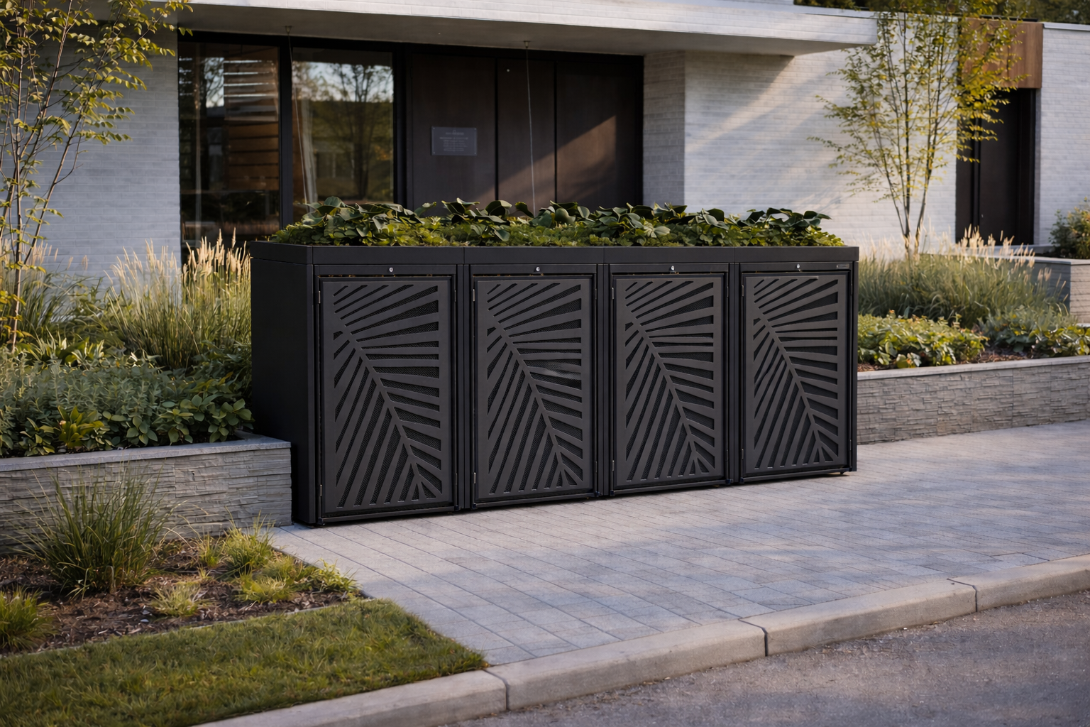 Nowoczesna zabudowa koszy śmietnikowych to funkcjonalne i estetyczne rozwiązanie stworzone z myślą o segregacji odpadów na posesjach prywatnych. Starannie zaprojektowana forma oraz dekoracyjne wypełnienia frontów sprawiają, że zabudowa TOP BOX INDIVIDUAL doskonale wpisuje się w nowoczesną architekturę i podnosi walory wizualne przestrzeni przydomowej. Pojemniki na odpady zostają elegancko ukryte, a całość stanowi spójny element aranżacji otoczenia budynku. Termin realizacji: 3–5 tygodni.