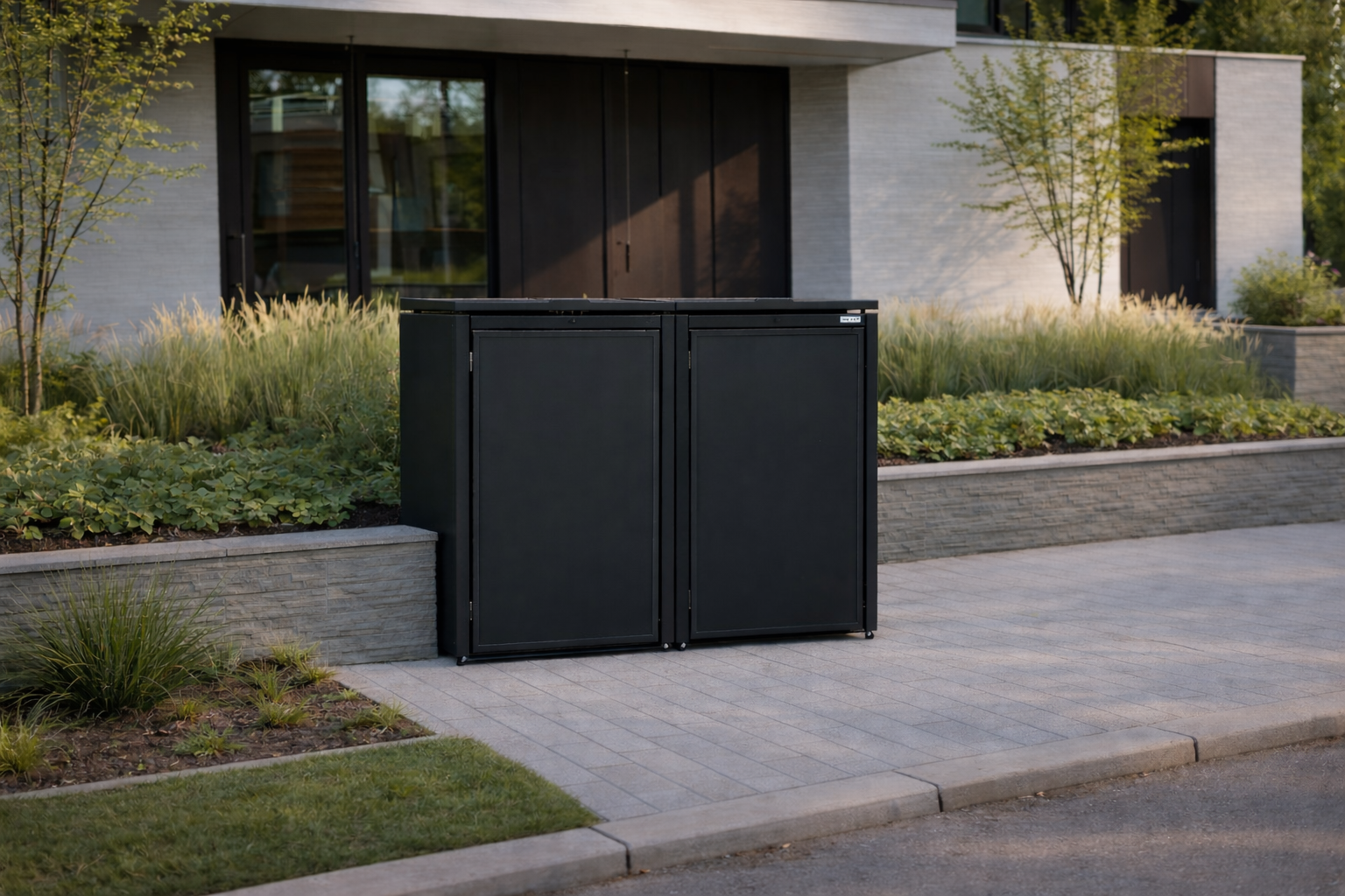 Dzięki przemyślanej konstrukcji pojemniki na odpady zostają estetycznie ukryte przed wzrokiem, stając się jednocześnie spójnym i designerskim elementem aranżacji posesji.