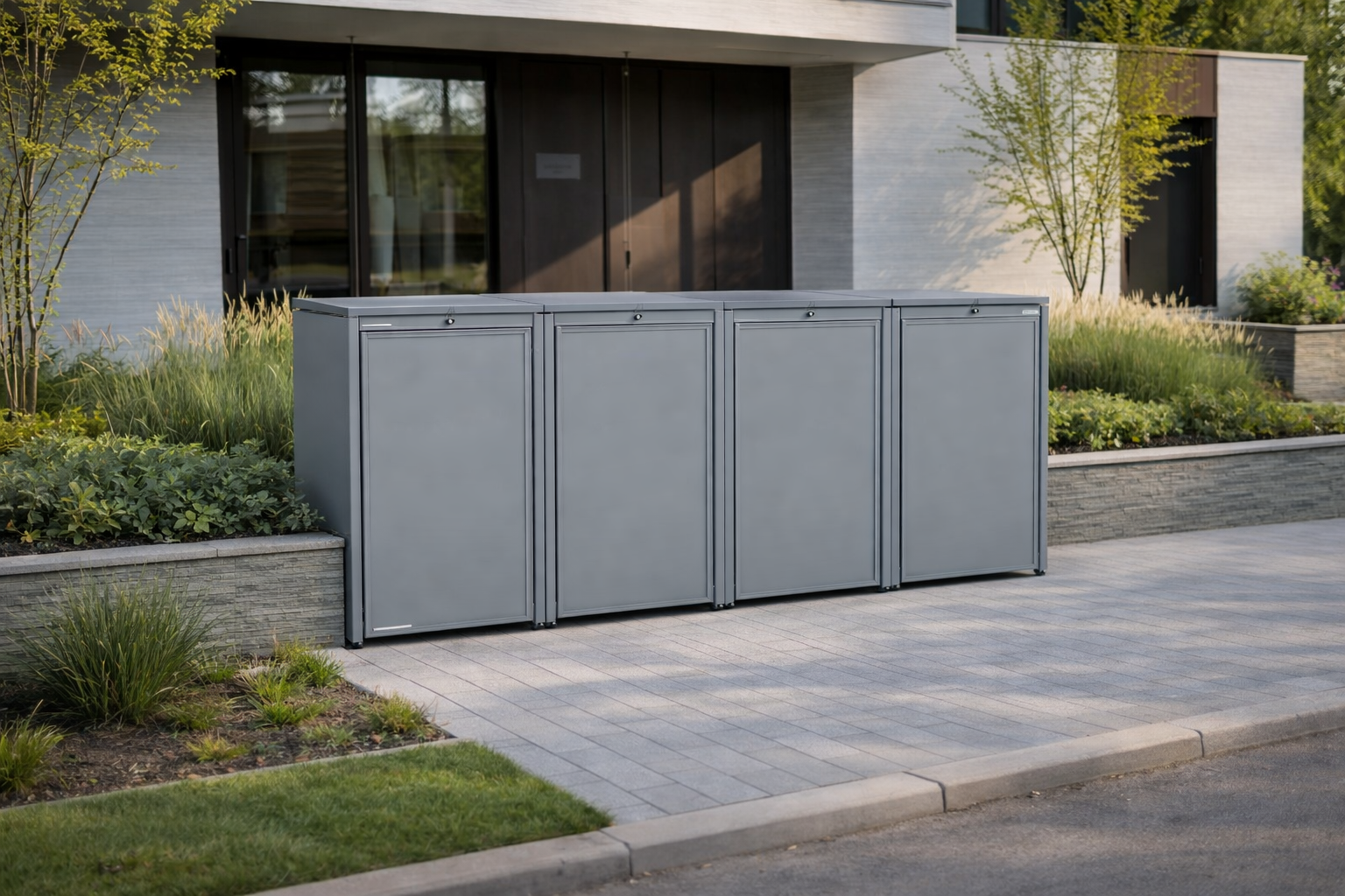 Obudowy posiadają uniwersalne wymiary, umożliwiające zastosowanie pojemników o pojemności od 120 do 240 litrów. Zarówno solidna konstrukcja, jak i drzwi frontowe wykonane ze stali ocynkowanej podkreślają nowoczesny, minimalistyczny charakter produktu, zapewniając jednocześnie wysoką odporność na warunki atmosferyczne oraz trwałość na lata.
