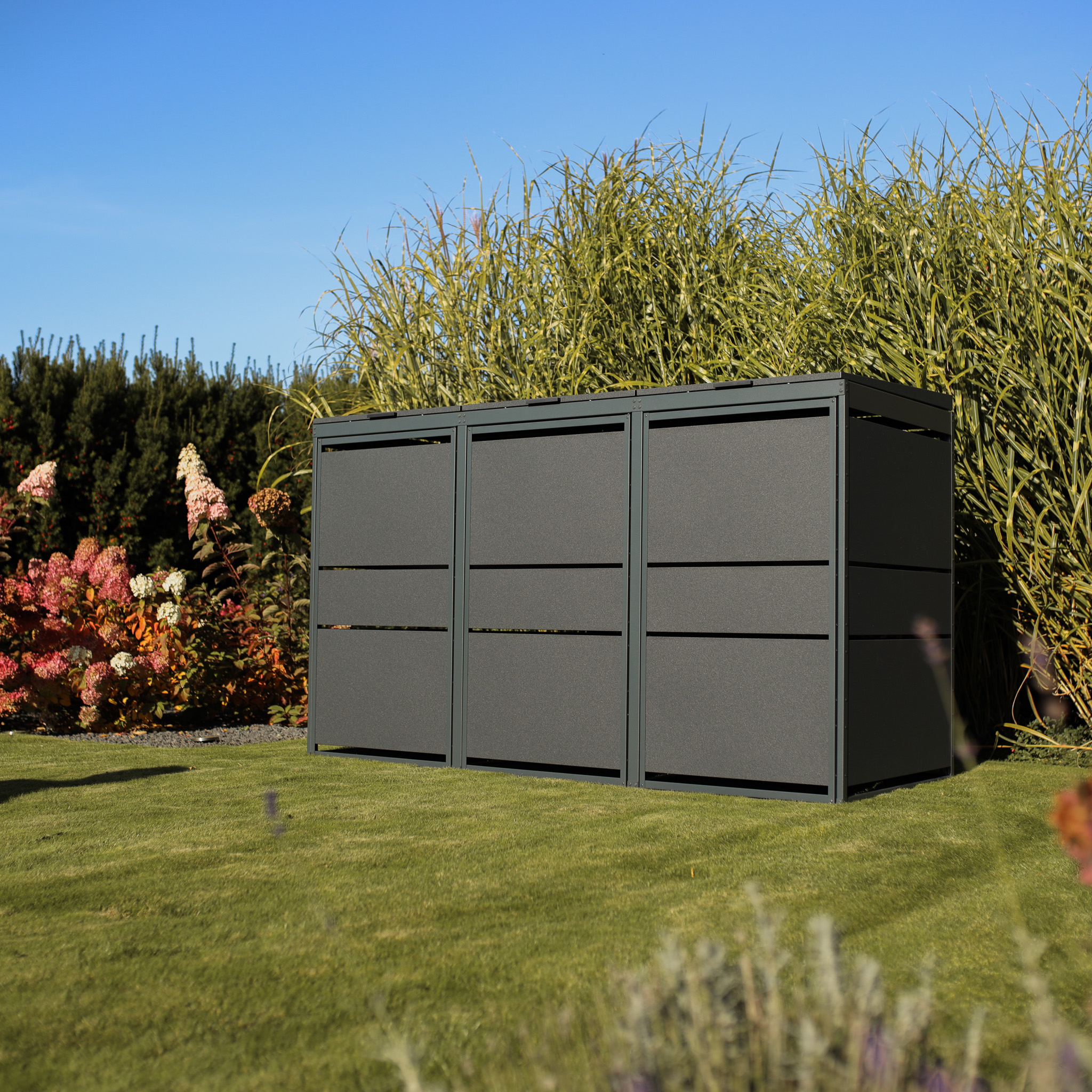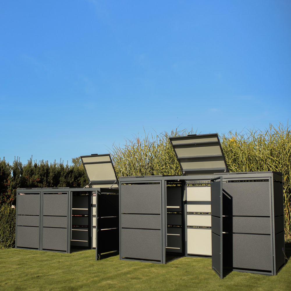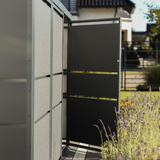 Nowoczesna zabudowa koszy śmietnikowych jest odpowiedzią na potrzebę związaną z segregacją odpadów na posesjach prywatnych i powstała z myślą aby utrzymać estetykę w reprezentacyjnej części działki. Zabudowa dzięki szerokim, poziomym panelom jest spójna z nowoczesną architekturą i doskonale komponuje się z otoczeniem.