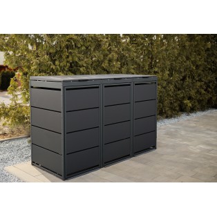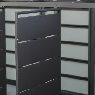 Nowoczesna zabudowa koszy śmietnikowych jest odpowiedzią na potrzebę związaną z segregacją odpadów na posesjach prywatnych i powstała z myślą aby utrzymać estetykę w reprezentacyjnej części działki. Zabudowa dzięki szerokim, poziomym panelom jest spójna z nowoczesną architekturą i doskonale komponuje się z otoczeniem.